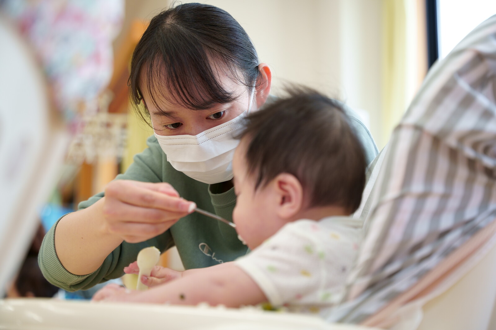 続いて、0歳児の離乳食の様子を見学しました。月齢の低い子は細く切られたパンをちょっとずつなめながら食べていましたが、半年ほど月齢が違うだけでお肉も器用に食べていて、成長のスピードに驚きました。小さな一口にも、子どもたちの成長のエネルギーがぎゅっと詰まっていました。